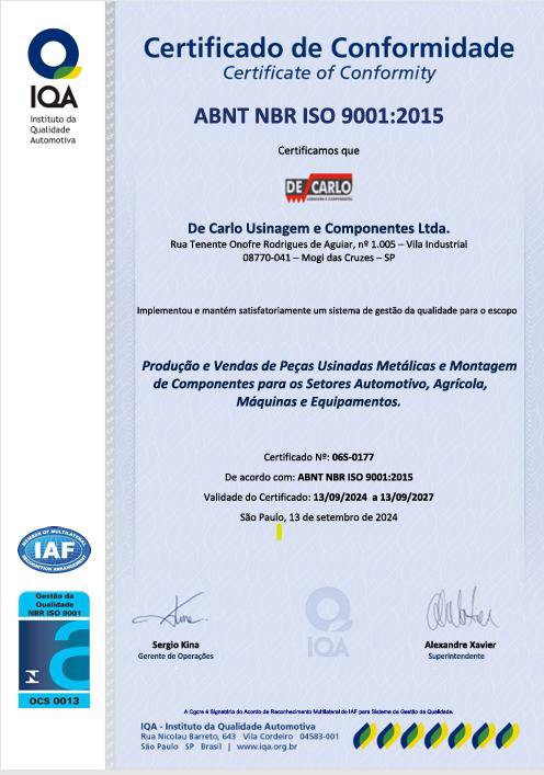 A DE CARLO USINAGEM E COMPONENTES LTDA reafirma seu compromisso com a qualidade, priorizando a satisfação dos clientes e o atendimento rigoroso aos requisitos aplicáveis. Nosso foco está na prevenção de defeitos, na redução de desperdícios e na melhoria contínua dos processos, garantindo excelência e competitividade no setor de usinagem.
